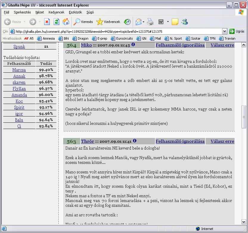| Új/módosult hírelemek | | Yaurri bányászverseny 3. | | Yaurri mászóverseny 3. | | Yaurri titkosírás verseny 2. | | Yaurri testépítő verseny 2. | | Titanitdukát aukció – 2024. nyár - nyertesek | | Olimpiák története | | A Sötétség Kora | | Termikrajzás 2. | | Yaurri felderítőverseny 2 | | Yaurri felderítőverseny | | XLIV. Alanori Mini Olimpia | | Yaurri kézművesverseny 2. | | Yaurri bányászverseny 2. | | Kalandozók Versenye 2. A Yaurri mászóverseny ma (február 14-én) indult! | | YAURRI TESTEDZŐ VERSENY | | Yaurri titkosírás verseny | | Termikrajzás | | Morf Invázió II. | | LVI. Alanori Olimpia | | XXXVI. Alanori Mini Olimpia | | Yaurri kézművesverseny | | Yaurri bányászverseny | | Plusz TP 2 hétig | | Kalandozók Versenye | | Névpályázat | | Meghalt VI. Borax | | Klasszikus TF 2. - zárás | | Résföld | | XXXIII. Alanori Mini Olimpia | | Végzet Verme 3 | | Élelemszerzés változások | | Elmaradt találkozó | | R.I.P. J.Lo | | Negatív Sík | | 53. Beholder Találkozó - 2020.07.18. szombat | | Titanitdukát aukció - 2020. nyár | | TIT3 titkosírás megfejtő | | R.I.P. | | Klasszikus TF | | Spunk - Pihi | | TRINIGAN RÚNÁJA (453. VARÁZSLÓ VARÁZSLAT) | | Szörny-, varázslat és tárgytervező pályázat | | Végzet Verme 2. | | Az Élet Síkja | | Fairlight bank kamatváltozás | | Szünet az Online táplálásban | | Morf invázió | | Túlélők Földje - Kapcsolat | | Automata táplálás ma délután 4-től élesben (2019. február 18.) | | Online táplálás csevegés (ex-Szerver karbantartás) | | A Tűz síkja | | L. Alanori Olimpia | | Nem hittétek, hogy komoly, mi? | | Hát ez (a) Bunkóság! | | Lemaradt KT-k fejlesztésének a segítése | | Házavató + afterparti Donnánál | | TF fórum - beszéljük meg! | | Élőholt invázió event 2018 | | 25 éves a TF - cikk a nerdblogon | | Új szigetek Erdauinon! | | Kvíz reloaded | | Vashegyek Nemzete KT. #9122 | | Jelentkezés az Olimpiára | | Befizetési akció 2017.06.08. - 2017.06.22. | | A Végzet Verme | | Beholder 25! | | Aukciós változás | | Túlélők 9172KT | | Eseménynaptár 2017 | | Túlélők Földje: Tűzvihar | | Ünnepi munkarend a Beholdernél | | Föld Létsíkja | | III. Quwarg rajzás állapotok | | Álláshirdetés Alanori Könyvtár | | 12! | | Víz Létsíkja | | TF Format a Beholder honlapon | | Letöltések a 4 napos ünnep idején | | Olimpiai Láng | | Kincsvadászat a Kiégett Földeken!!! | | Kvííííz! | | Szabad Kompánia - Toborzás | | Nyugati fejlesztés | | Arany Nyúl Díj '15 | | Tárgy- és varázslattervezői pályázat | | III. Quwarg Invázió előzetes | | Olimpiai Aukció 2015.11.28 | | Túlélők Földje tárgy- és varázslattervezői pályázat | | Társasjáték tesztelés (Startupper Game) | | Kufár hiányában... | | XLIII. BEHOLDER TALÁLKOZÓ PROGRAMJA | | Masszainvázió!!! | | Péntek 13. - Folytatás a Naplók menüben | | Keresem, kutatom | | Idétlen időkig TF... 20 éve | | Bea Melindre és William Madden nagy napja :) | | Közös Tudatok listája | | Új event kibeszélő | | Az átalakulás megkezdődött | | Olimpiai Aukció 2014.11.29 (v11.2) | | Erdauini hírek | | Hétvégi letöltés dömping :) | | Technika ördöge | | Letöltés Október 18-án | | Elementál rajzás | | TS3 szerver | | Két magányos lélek! | | Olimpiai Aukció 2014.06.21 (v10.2) | | Varkaudar-Thargodan Invázió | | 10 éves a GN! | | Bunkó Akadémia | | Ezüstszelence | | Ünnepi munkarend | | Kalandozók Figyelem | | Olimpiai Aukció 2013.11.30 (v9.2) | | Téli Aukció hírek | | Toronyháború 2. | | Házasodott a gizda | | Reloaded | | Help (nem tf) | | Hogyan lesz a Vajákosnak piszkafája? | | Lemaradás vásárlás | | Olimpiai Aukció 2013.06.22. (v8.0) | | Péntek esti bemelegítés | | AK-s labirintusok és krónika (#1725) | | Tárgytervezői pályázat | | Egy ma született húsvéti bárány :-) | | Szerezz ajándékot Túlélők Földje vagy Végzetúr karaktered számára. | | Térkép a netes fordulókban | | Túlélők Földje Bónuszok | | Varázslatok fejlesztése | | II. Quwarg rajzás | | NJK tervezői pályázat - Eredményhirdetés | | Jelenlét bónusz | | EXTRA | | VÉRTVORNYAAAAAA!!!!!!! | | Melegítés a talira | | Olimpiai Aukció 2012.11.24. (v7.0) | | MAFFIA KT Reborn | | NJK Tervezői Pályázat | | II. Quwarg rajzás - Ryuku szigetek | | Probléma | | FOCI EB (vaúúúúúú) JÁTÉK | | Nyilt level Krapixlon Authir olimpiai foszervezonek | | Olimpiai Aukció 2012.06.23. (v6.0) | | ÁRNYMENŐK (#9153 KT) tagokat keres! | | A XXXVII. Beholder találkozó programja | | Rius featuring Koc a Milliomosban | | Közös TF-es Yahoo-s listák | | Elhunyt Wachek Norbi (White Nor Wacak) | | Pályázatok a Túlélők Földje játékosainak a XXXVII. Beholder Találkozóra! | | Quwrag rajzások hősei 2. | | Szakértelem revamp | | Bunkó Akadémia | | A quwarg rajzás hősei | | I. Káosz Bál | | 1. Tesztolimpia | | Tudásbázis moderátorokat keresek | | Quwarg Rajzás 2. | | A Korona Bajnokai (#9125) tagfelvételt hirdet | | új TK-k | | Quwarg rajzás 2 | | Beholder Kft. - Ünnepi munkarend | | Elkezdődött a II. quwarg rajzás? | | Tesztolimpia | | Aukció | | TF fórum - beszéljük meg! | | Olimpiai Aukció 2011.11.26. (v5.0) | | Fogadás! | | Az Ország Boltja verseny - +5% TP | | Mínosz-kúpok a Kiégett Földeken | | Kilépés a KT-ból | | Adatbázis-bővítés | | XXXVI. Beholder találkozó | | Ébredés | | Tag felvétel | | Változások 2011.09.29. | | Rendkívüli tf-fórum | | Beállítós UL | | Lemaradás vásárlás - véglegesítve | | Lemaradás vásárlás | | Tali Aukció 2011.06.18. (v 4.0) | | TVP termelő kiskapu | | Borax király beteg | | A XXXV. Beholder találkozó programja | | Vertestverek LAST MINUTE | | Ünnepi munkarend | | Új terület: Kiégett Föld | | TF talis aukció v3.0 | | A XXXIV. Beholder találkozó programja | | Erőpróba | | Várkuti találkozó hely