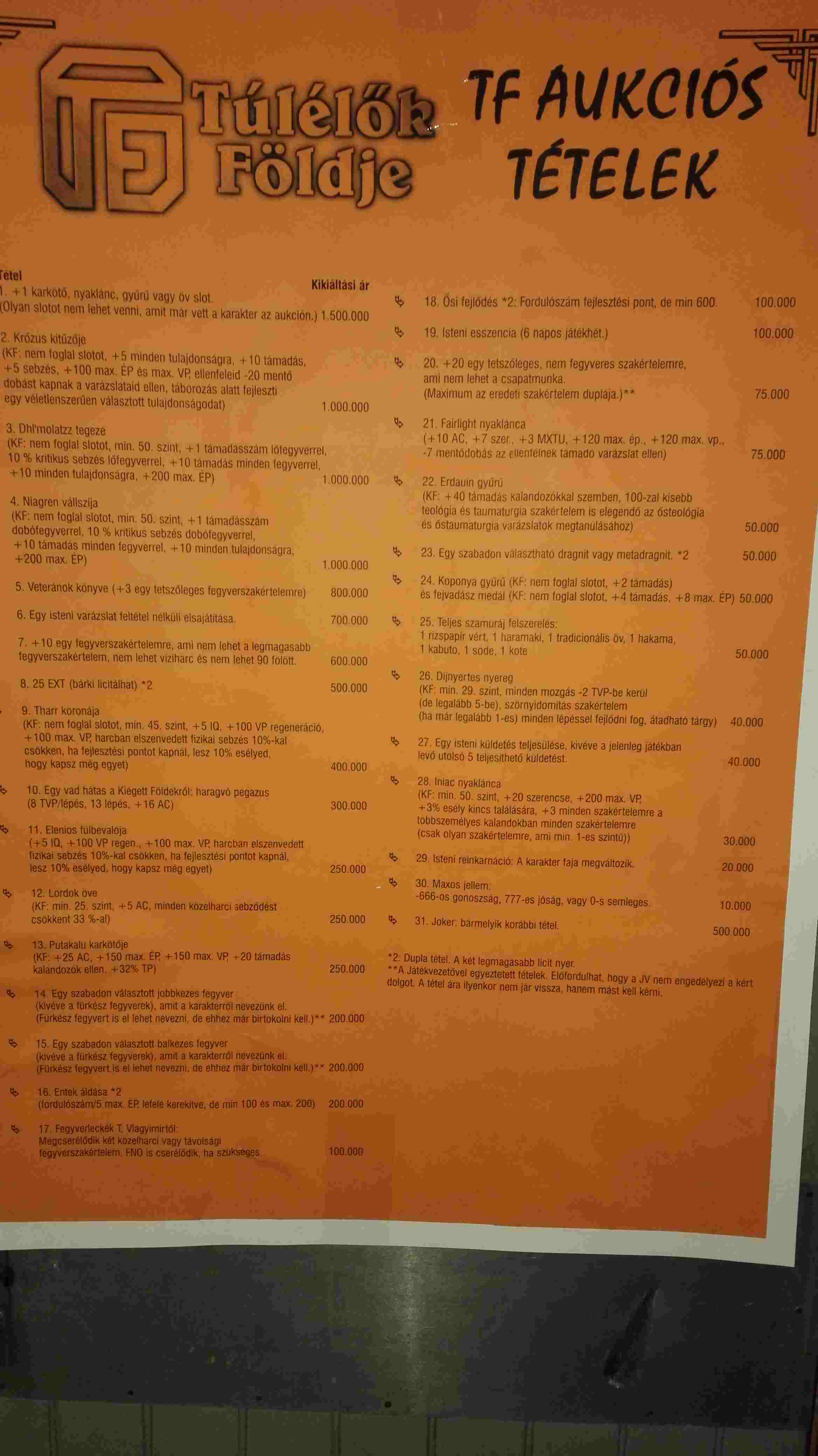 | Új/módosult hírelemek | | Yaurri bányászverseny 3. | | Yaurri mászóverseny 3. | | Yaurri titkosírás verseny 2. | | Yaurri testépítő verseny 2. | | Titanitdukát aukció – 2024. nyár - nyertesek | | Olimpiák története | | A Sötétség Kora | | Termikrajzás 2. | | Yaurri felderítőverseny 2 | | Yaurri felderítőverseny | | XLIV. Alanori Mini Olimpia | | Yaurri kézművesverseny 2. | | Yaurri bányászverseny 2. | | Kalandozók Versenye 2. A Yaurri mászóverseny ma (február 14-én) indult! | | YAURRI TESTEDZŐ VERSENY | | Yaurri titkosírás verseny | | Termikrajzás | | Morf Invázió II. | | LVI. Alanori Olimpia | | XXXVI. Alanori Mini Olimpia | | Yaurri kézművesverseny | | Yaurri bányászverseny | | Plusz TP 2 hétig | | Kalandozók Versenye | | Névpályázat | | Meghalt VI. Borax | | Klasszikus TF 2. - zárás | | Résföld | | XXXIII. Alanori Mini Olimpia | | Végzet Verme 3 | | Élelemszerzés változások | | Elmaradt találkozó | | R.I.P. J.Lo | | Negatív Sík | | 53. Beholder Találkozó - 2020.07.18. szombat | | Titanitdukát aukció - 2020. nyár | | TIT3 titkosírás megfejtő | | R.I.P. | | Klasszikus TF | | Spunk - Pihi | | TRINIGAN RÚNÁJA (453. VARÁZSLÓ VARÁZSLAT) | | Szörny-, varázslat és tárgytervező pályázat | | Végzet Verme 2. | | Az Élet Síkja | | Fairlight bank kamatváltozás | | Szünet az Online táplálásban | | Morf invázió | | Túlélők Földje - Kapcsolat | | Automata táplálás ma délután 4-től élesben (2019. február 18.) | | Online táplálás csevegés (ex-Szerver karbantartás) | | A Tűz síkja | | L. Alanori Olimpia | | Nem hittétek, hogy komoly, mi? | | Hát ez (a) Bunkóság! | | Lemaradt KT-k fejlesztésének a segítése | | Házavató + afterparti Donnánál | | TF fórum - beszéljük meg! | | Élőholt invázió event 2018 | | 25 éves a TF - cikk a nerdblogon | | Új szigetek Erdauinon! | | Kvíz reloaded | | Vashegyek Nemzete KT. #9122 | | Jelentkezés az Olimpiára | | Befizetési akció 2017.06.08. - 2017.06.22. | | A Végzet Verme | | Beholder 25! | | Aukciós változás | | Túlélők 9172KT | | Eseménynaptár 2017 | | Túlélők Földje: Tűzvihar | | Ünnepi munkarend a Beholdernél | | Föld Létsíkja | | III. Quwarg rajzás állapotok | | Álláshirdetés Alanori Könyvtár | | 12! | | Víz Létsíkja | | TF Format a Beholder honlapon | | Letöltések a 4 napos ünnep idején | | Olimpiai Láng | | Kincsvadászat a Kiégett Földeken!!! | | Kvííííz! | | Szabad Kompánia - Toborzás | | Nyugati fejlesztés | | Arany Nyúl Díj '15 | | Tárgy- és varázslattervezői pályázat | | III. Quwarg Invázió előzetes | | Olimpiai Aukció 2015.11.28 | | Túlélők Földje tárgy- és varázslattervezői pályázat | | Társasjáték tesztelés (Startupper Game) | | Kufár hiányában... | | XLIII. BEHOLDER TALÁLKOZÓ PROGRAMJA | | Masszainvázió!!! | | Péntek 13. - Folytatás a Naplók menüben | | Keresem, kutatom | | Idétlen időkig TF... 20 éve | | Bea Melindre és William Madden nagy napja :) | | Közös Tudatok listája | | Új event kibeszélő | | Az átalakulás megkezdődött | | Olimpiai Aukció 2014.11.29 (v11.2) | | Erdauini hírek | | Hétvégi letöltés dömping :) | | Technika ördöge | | Letöltés Október 18-án | | Elementál rajzás | | TS3 szerver | | Két magányos lélek! | | Olimpiai Aukció 2014.06.21 (v10.2) | | Varkaudar-Thargodan Invázió | | 10 éves a GN! | | Bunkó Akadémia | | Ezüstszelence | | Ünnepi munkarend | | Kalandozók Figyelem | | Olimpiai Aukció 2013.11.30 (v9.2) | | Téli Aukció hírek | | Toronyháború 2. | | Házasodott a gizda | | Reloaded | | Help (nem tf) | | Hogyan lesz a Vajákosnak piszkafája? | | Lemaradás vásárlás | | Olimpiai Aukció 2013.06.22. (v8.0) | | Péntek esti bemelegítés | | AK-s labirintusok és krónika (#1725) | | Tárgytervezői pályázat | | Egy ma született húsvéti bárány :-) | | Szerezz ajándékot Túlélők Földje vagy Végzetúr karaktered számára. | | Térkép a netes fordulókban | | Túlélők Földje Bónuszok | | Varázslatok fejlesztése | | II. Quwarg rajzás | | NJK tervezői pályázat - Eredményhirdetés | | Jelenlét bónusz | | EXTRA | | VÉRTVORNYAAAAAA!!!!!!! | | Melegítés a talira | | Olimpiai Aukció 2012.11.24. (v7.0) | | MAFFIA KT Reborn | | NJK Tervezői Pályázat | | II. Quwarg rajzás - Ryuku szigetek | | Probléma | | FOCI EB (vaúúúúúú) JÁTÉK | | Nyilt level Krapixlon Authir olimpiai foszervezonek | | Olimpiai Aukció 2012.06.23. (v6.0) | | ÁRNYMENŐK (#9153 KT) tagokat keres! | | A XXXVII. Beholder találkozó programja | | Rius featuring Koc a Milliomosban | | Közös TF-es Yahoo-s listák | | Elhunyt Wachek Norbi (White Nor Wacak) | | Pályázatok a Túlélők Földje játékosainak a XXXVII. Beholder Találkozóra! | | Quwrag rajzások hősei 2. | | Szakértelem revamp | | Bunkó Akadémia | | A quwarg rajzás hősei | | I. Káosz Bál | | 1. Tesztolimpia | | Tudásbázis moderátorokat keresek | | Quwarg Rajzás 2. | | A Korona Bajnokai (#9125) tagfelvételt hirdet | | új TK-k | | Quwarg rajzás 2 | | Beholder Kft. - Ünnepi munkarend | | Elkezdődött a II. quwarg rajzás? | | Tesztolimpia | | Aukció | | TF fórum - beszéljük meg! | | Olimpiai Aukció 2011.11.26. (v5.0) | | Fogadás! | | Az Ország Boltja verseny - +5% TP | | Mínosz-kúpok a Kiégett Földeken | | Kilépés a KT-ból | | Adatbázis-bővítés | | XXXVI. Beholder találkozó | | Ébredés | | Tag felvétel | | Változások 2011.09.29. | | Rendkívüli tf-fórum | | Beállítós UL | | Lemaradás vásárlás - véglegesítve | | Lemaradás vásárlás | | Tali Aukció 2011.06.18. (v 4.0) | | TVP termelő kiskapu | | Borax király beteg | | A XXXV. Beholder találkozó programja | | Vertestverek LAST MINUTE | | Ünnepi munkarend | | Új terület: Kiégett Föld | | TF talis aukció v3.0 | | A XXXIV. Beholder találkozó programja | | Erőpróba | | Várkuti találkozó hely