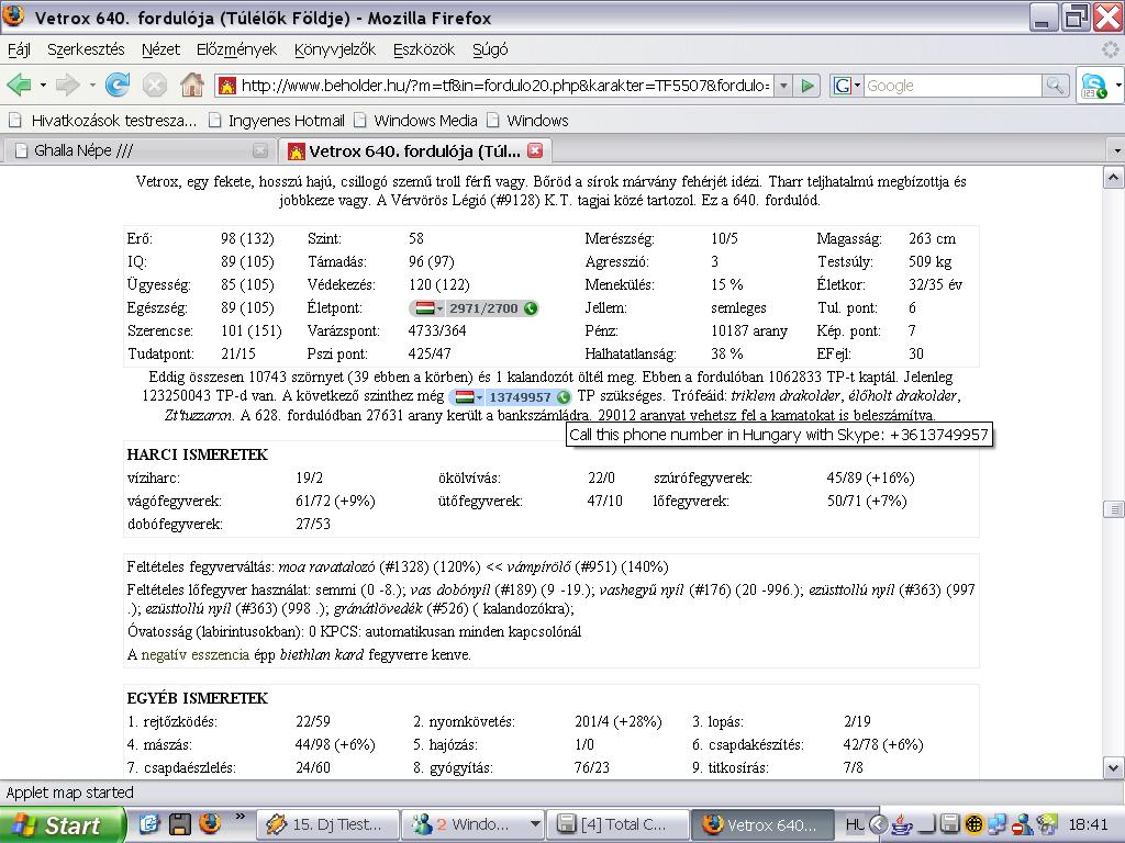 | Új/módosult hírelemek | | Yaurri bányászverseny 3. | | Yaurri mászóverseny 3. | | Yaurri titkosírás verseny 2. | | Yaurri testépítő verseny 2. | | Titanitdukát aukció – 2024. nyár - nyertesek | | Olimpiák története | | A Sötétség Kora | | Termikrajzás 2. | | Yaurri felderítőverseny 2 | | Yaurri felderítőverseny | | XLIV. Alanori Mini Olimpia | | Yaurri kézművesverseny 2. | | Yaurri bányászverseny 2. | | Kalandozók Versenye 2. A Yaurri mászóverseny ma (február 14-én) indult! | | YAURRI TESTEDZŐ VERSENY | | Yaurri titkosírás verseny | | Termikrajzás | | Morf Invázió II. | | LVI. Alanori Olimpia | | XXXVI. Alanori Mini Olimpia | | Yaurri kézművesverseny | | Yaurri bányászverseny | | Plusz TP 2 hétig | | Kalandozók Versenye | | Névpályázat | | Meghalt VI. Borax | | Klasszikus TF 2. - zárás | | Résföld | | XXXIII. Alanori Mini Olimpia | | Végzet Verme 3 | | Élelemszerzés változások | | Elmaradt találkozó | | R.I.P. J.Lo | | Negatív Sík | | 53. Beholder Találkozó - 2020.07.18. szombat | | Titanitdukát aukció - 2020. nyár | | TIT3 titkosírás megfejtő | | R.I.P. | | Klasszikus TF | | Spunk - Pihi | | TRINIGAN RÚNÁJA (453. VARÁZSLÓ VARÁZSLAT) | | Szörny-, varázslat és tárgytervező pályázat | | Végzet Verme 2. | | Az Élet Síkja | | Fairlight bank kamatváltozás | | Szünet az Online táplálásban | | Morf invázió | | Túlélők Földje - Kapcsolat | | Automata táplálás ma délután 4-től élesben (2019. február 18.) | | Online táplálás csevegés (ex-Szerver karbantartás) | | A Tűz síkja | | L. Alanori Olimpia | | Nem hittétek, hogy komoly, mi? | | Hát ez (a) Bunkóság! | | Lemaradt KT-k fejlesztésének a segítése | | Házavató + afterparti Donnánál | | TF fórum - beszéljük meg! | | Élőholt invázió event 2018 | | 25 éves a TF - cikk a nerdblogon | | Új szigetek Erdauinon! | | Kvíz reloaded | | Vashegyek Nemzete KT. #9122 | | Jelentkezés az Olimpiára | | Befizetési akció 2017.06.08. - 2017.06.22. | | A Végzet Verme | | Beholder 25! | | Aukciós változás | | Túlélők 9172KT | | Eseménynaptár 2017 | | Túlélők Földje: Tűzvihar | | Ünnepi munkarend a Beholdernél | | Föld Létsíkja | | III. Quwarg rajzás állapotok | | Álláshirdetés Alanori Könyvtár | | 12! | | Víz Létsíkja | | TF Format a Beholder honlapon | | Letöltések a 4 napos ünnep idején | | Olimpiai Láng | | Kincsvadászat a Kiégett Földeken!!! | | Kvííííz! | | Szabad Kompánia - Toborzás | | Nyugati fejlesztés | | Arany Nyúl Díj '15 | | Tárgy- és varázslattervezői pályázat | | III. Quwarg Invázió előzetes | | Olimpiai Aukció 2015.11.28 | | Túlélők Földje tárgy- és varázslattervezői pályázat | | Társasjáték tesztelés (Startupper Game) | | Kufár hiányában... | | XLIII. BEHOLDER TALÁLKOZÓ PROGRAMJA | | Masszainvázió!!! | | Péntek 13. - Folytatás a Naplók menüben | | Keresem, kutatom | | Idétlen időkig TF... 20 éve | | Bea Melindre és William Madden nagy napja :) | | Közös Tudatok listája | | Új event kibeszélő | | Az átalakulás megkezdődött | | Olimpiai Aukció 2014.11.29 (v11.2) | | Erdauini hírek | | Hétvégi letöltés dömping :) | | Technika ördöge | | Letöltés Október 18-án | | Elementál rajzás | | TS3 szerver | | Két magányos lélek! | | Olimpiai Aukció 2014.06.21 (v10.2) | | Varkaudar-Thargodan Invázió | | 10 éves a GN! | | Bunkó Akadémia | | Ezüstszelence | | Ünnepi munkarend | | Kalandozók Figyelem | | Olimpiai Aukció 2013.11.30 (v9.2) | | Téli Aukció hírek | | Toronyháború 2. | | Házasodott a gizda | | Reloaded | | Help (nem tf) | | Hogyan lesz a Vajákosnak piszkafája? | | Lemaradás vásárlás | | Olimpiai Aukció 2013.06.22. (v8.0) | | Péntek esti bemelegítés | | AK-s labirintusok és krónika (#1725) | | Tárgytervezői pályázat | | Egy ma született húsvéti bárány :-) | | Szerezz ajándékot Túlélők Földje vagy Végzetúr karaktered számára. | | Térkép a netes fordulókban | | Túlélők Földje Bónuszok | | Varázslatok fejlesztése | | II. Quwarg rajzás | | NJK tervezői pályázat - Eredményhirdetés | | Jelenlét bónusz | | EXTRA | | VÉRTVORNYAAAAAA!!!!!!! | | Melegítés a talira | | Olimpiai Aukció 2012.11.24. (v7.0) | | MAFFIA KT Reborn | | NJK Tervezői Pályázat | | II. Quwarg rajzás - Ryuku szigetek | | Probléma | | FOCI EB (vaúúúúúú) JÁTÉK | | Nyilt level Krapixlon Authir olimpiai foszervezonek | | Olimpiai Aukció 2012.06.23. (v6.0) | | ÁRNYMENŐK (#9153 KT) tagokat keres! | | A XXXVII. Beholder találkozó programja | | Rius featuring Koc a Milliomosban | | Közös TF-es Yahoo-s listák | | Elhunyt Wachek Norbi (White Nor Wacak) | | Pályázatok a Túlélők Földje játékosainak a XXXVII. Beholder Találkozóra! | | Quwrag rajzások hősei 2. | | Szakértelem revamp | | Bunkó Akadémia | | A quwarg rajzás hősei | | I. Káosz Bál | | 1. Tesztolimpia | | Tudásbázis moderátorokat keresek | | Quwarg Rajzás 2. | | A Korona Bajnokai (#9125) tagfelvételt hirdet | | új TK-k | | Quwarg rajzás 2 | | Beholder Kft. - Ünnepi munkarend | | Elkezdődött a II. quwarg rajzás? | | Tesztolimpia | | Aukció | | TF fórum - beszéljük meg! | | Olimpiai Aukció 2011.11.26. (v5.0) | | Fogadás! | | Az Ország Boltja verseny - +5% TP | | Mínosz-kúpok a Kiégett Földeken | | Kilépés a KT-ból | | Adatbázis-bővítés | | XXXVI. Beholder találkozó | | Ébredés | | Tag felvétel | | Változások 2011.09.29. | | Rendkívüli tf-fórum | | Beállítós UL | | Lemaradás vásárlás - véglegesítve | | Lemaradás vásárlás | | Tali Aukció 2011.06.18. (v 4.0) | | TVP termelő kiskapu | | Borax király beteg | | A XXXV. Beholder találkozó programja | | Vertestverek LAST MINUTE | | Ünnepi munkarend | | Új terület: Kiégett Föld | | TF talis aukció v3.0 | | A XXXIV. Beholder találkozó programja | | Erőpróba | | Várkuti találkozó hely