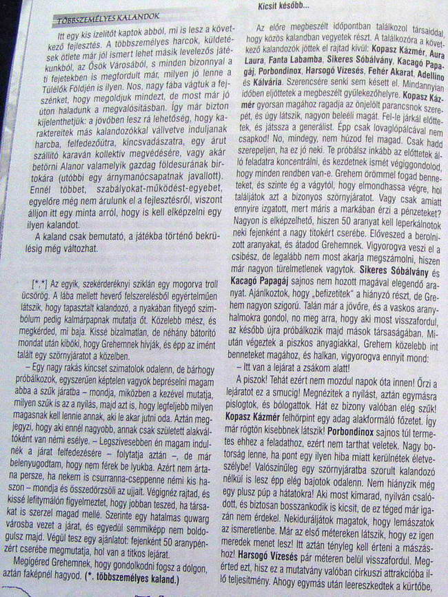 | Új/módosult hírelemek | | Yaurri bányászverseny 3. | | Yaurri mászóverseny 3. | | Yaurri titkosírás verseny 2. | | Yaurri testépítő verseny 2. | | Titanitdukát aukció – 2024. nyár - nyertesek | | Olimpiák története | | A Sötétség Kora | | Termikrajzás 2. | | Yaurri felderítőverseny 2 | | Yaurri felderítőverseny | | XLIV. Alanori Mini Olimpia | | Yaurri kézművesverseny 2. | | Yaurri bányászverseny 2. | | Kalandozók Versenye 2. A Yaurri mászóverseny ma (február 14-én) indult! | | YAURRI TESTEDZŐ VERSENY | | Yaurri titkosírás verseny | | Termikrajzás | | Morf Invázió II. | | LVI. Alanori Olimpia | | XXXVI. Alanori Mini Olimpia | | Yaurri kézművesverseny | | Yaurri bányászverseny | | Plusz TP 2 hétig | | Kalandozók Versenye | | Névpályázat | | Meghalt VI. Borax | | Klasszikus TF 2. - zárás | | Résföld | | XXXIII. Alanori Mini Olimpia | | Végzet Verme 3 | | Élelemszerzés változások | | Elmaradt találkozó | | R.I.P. J.Lo | | Negatív Sík | | 53. Beholder Találkozó - 2020.07.18. szombat | | Titanitdukát aukció - 2020. nyár | | TIT3 titkosírás megfejtő | | R.I.P. | | Klasszikus TF | | Spunk - Pihi | | TRINIGAN RÚNÁJA (453. VARÁZSLÓ VARÁZSLAT) | | Szörny-, varázslat és tárgytervező pályázat | | Végzet Verme 2. | | Az Élet Síkja | | Fairlight bank kamatváltozás | | Szünet az Online táplálásban | | Morf invázió | | Túlélők Földje - Kapcsolat | | Automata táplálás ma délután 4-től élesben (2019. február 18.) | | Online táplálás csevegés (ex-Szerver karbantartás) | | A Tűz síkja | | L. Alanori Olimpia | | Nem hittétek, hogy komoly, mi? | | Hát ez (a) Bunkóság! | | Lemaradt KT-k fejlesztésének a segítése | | Házavató + afterparti Donnánál | | TF fórum - beszéljük meg! | | Élőholt invázió event 2018 | | 25 éves a TF - cikk a nerdblogon | | Új szigetek Erdauinon! | | Kvíz reloaded | | Vashegyek Nemzete KT. #9122 | | Jelentkezés az Olimpiára | | Befizetési akció 2017.06.08. - 2017.06.22. | | A Végzet Verme | | Beholder 25! | | Aukciós változás | | Túlélők 9172KT | | Eseménynaptár 2017 | | Túlélők Földje: Tűzvihar | | Ünnepi munkarend a Beholdernél | | Föld Létsíkja | | III. Quwarg rajzás állapotok | | Álláshirdetés Alanori Könyvtár | | 12! | | Víz Létsíkja | | TF Format a Beholder honlapon | | Letöltések a 4 napos ünnep idején | | Olimpiai Láng | | Kincsvadászat a Kiégett Földeken!!! | | Kvííííz! | | Szabad Kompánia - Toborzás | | Nyugati fejlesztés | | Arany Nyúl Díj '15 | | Tárgy- és varázslattervezői pályázat | | III. Quwarg Invázió előzetes | | Olimpiai Aukció 2015.11.28 | | Túlélők Földje tárgy- és varázslattervezői pályázat | | Társasjáték tesztelés (Startupper Game) | | Kufár hiányában... | | XLIII. BEHOLDER TALÁLKOZÓ PROGRAMJA | | Masszainvázió!!! | | Péntek 13. - Folytatás a Naplók menüben | | Keresem, kutatom | | Idétlen időkig TF... 20 éve | | Bea Melindre és William Madden nagy napja :) | | Közös Tudatok listája | | Új event kibeszélő | | Az átalakulás megkezdődött | | Olimpiai Aukció 2014.11.29 (v11.2) | | Erdauini hírek | | Hétvégi letöltés dömping :) | | Technika ördöge | | Letöltés Október 18-án | | Elementál rajzás | | TS3 szerver | | Két magányos lélek! | | Olimpiai Aukció 2014.06.21 (v10.2) | | Varkaudar-Thargodan Invázió | | 10 éves a GN! | | Bunkó Akadémia | | Ezüstszelence | | Ünnepi munkarend | | Kalandozók Figyelem | | Olimpiai Aukció 2013.11.30 (v9.2) | | Téli Aukció hírek | | Toronyháború 2. | | Házasodott a gizda | | Reloaded | | Help (nem tf) | | Hogyan lesz a Vajákosnak piszkafája? | | Lemaradás vásárlás | | Olimpiai Aukció 2013.06.22. (v8.0) | | Péntek esti bemelegítés | | AK-s labirintusok és krónika (#1725) | | Tárgytervezői pályázat | | Egy ma született húsvéti bárány :-) | | Szerezz ajándékot Túlélők Földje vagy Végzetúr karaktered számára. | | Térkép a netes fordulókban | | Túlélők Földje Bónuszok | | Varázslatok fejlesztése | | II. Quwarg rajzás | | NJK tervezői pályázat - Eredményhirdetés | | Jelenlét bónusz | | EXTRA | | VÉRTVORNYAAAAAA!!!!!!! | | Melegítés a talira | | Olimpiai Aukció 2012.11.24. (v7.0) | | MAFFIA KT Reborn | | NJK Tervezői Pályázat | | II. Quwarg rajzás - Ryuku szigetek | | Probléma | | FOCI EB (vaúúúúúú) JÁTÉK | | Nyilt level Krapixlon Authir olimpiai foszervezonek | | Olimpiai Aukció 2012.06.23. (v6.0) | | ÁRNYMENŐK (#9153 KT) tagokat keres! | | A XXXVII. Beholder találkozó programja | | Rius featuring Koc a Milliomosban | | Közös TF-es Yahoo-s listák | | Elhunyt Wachek Norbi (White Nor Wacak) | | Pályázatok a Túlélők Földje játékosainak a XXXVII. Beholder Találkozóra! | | Quwrag rajzások hősei 2. | | Szakértelem revamp | | Bunkó Akadémia | | A quwarg rajzás hősei | | I. Káosz Bál | | 1. Tesztolimpia | | Tudásbázis moderátorokat keresek | | Quwarg Rajzás 2. | | A Korona Bajnokai (#9125) tagfelvételt hirdet | | új TK-k | | Quwarg rajzás 2 | | Beholder Kft. - Ünnepi munkarend | | Elkezdődött a II. quwarg rajzás? | | Tesztolimpia | | Aukció | | TF fórum - beszéljük meg! | | Olimpiai Aukció 2011.11.26. (v5.0) | | Fogadás! | | Az Ország Boltja verseny - +5% TP | | Mínosz-kúpok a Kiégett Földeken | | Kilépés a KT-ból | | Adatbázis-bővítés | | XXXVI. Beholder találkozó | | Ébredés | | Tag felvétel | | Változások 2011.09.29. | | Rendkívüli tf-fórum | | Beállítós UL | | Lemaradás vásárlás - véglegesítve | | Lemaradás vásárlás | | Tali Aukció 2011.06.18. (v 4.0) | | TVP termelő kiskapu | | Borax király beteg | | A XXXV. Beholder találkozó programja | | Vertestverek LAST MINUTE | | Ünnepi munkarend | | Új terület: Kiégett Föld | | TF talis aukció v3.0 | | A XXXIV. Beholder találkozó programja | | Erőpróba | | Várkuti találkozó hely