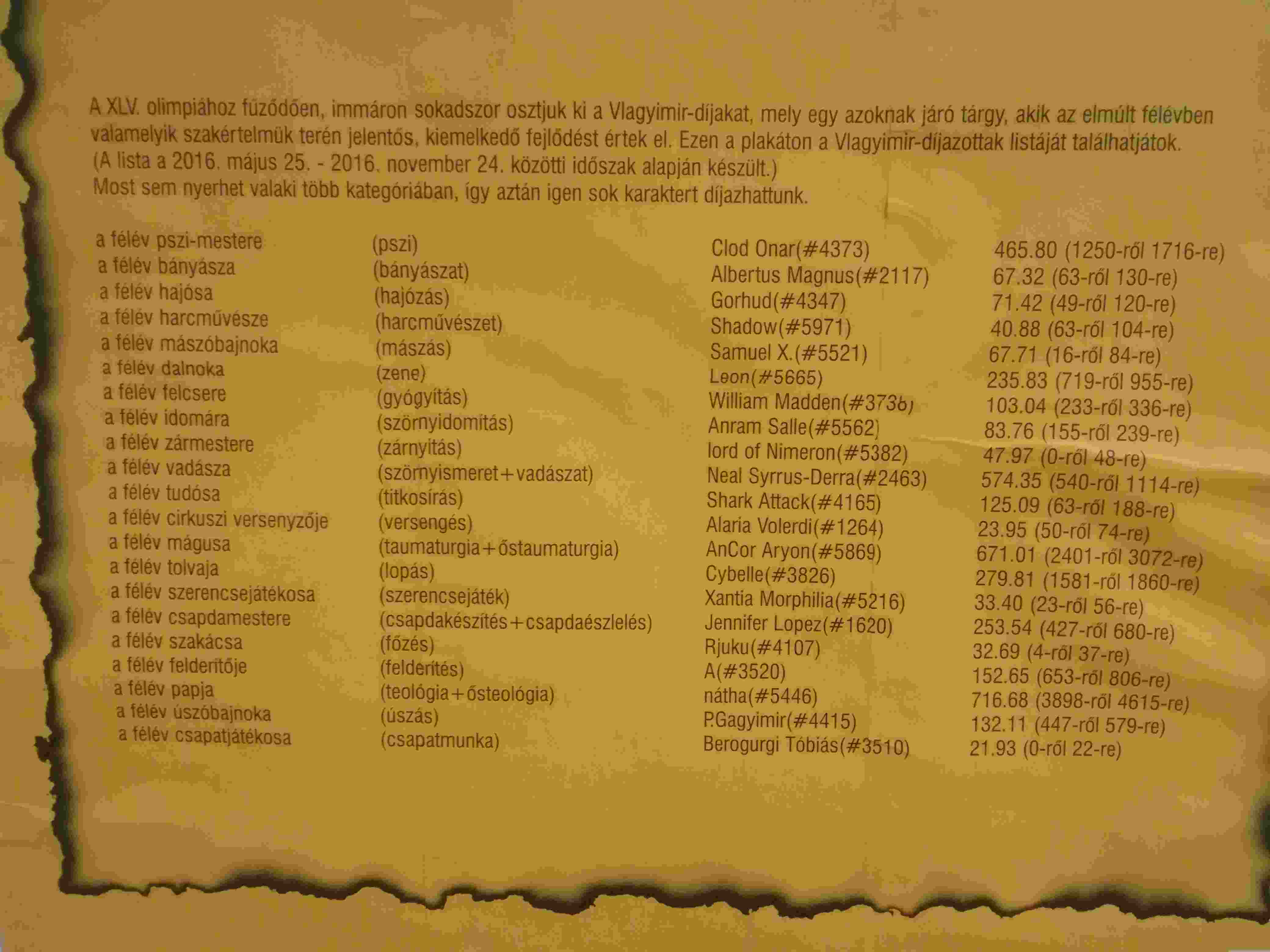 | Új/módosult hírelemek | | Yaurri bányászverseny 3. | | Yaurri mászóverseny 3. | | Yaurri titkosírás verseny 2. | | Yaurri testépítő verseny 2. | | Titanitdukát aukció – 2024. nyár - nyertesek | | Olimpiák története | | A Sötétség Kora | | Termikrajzás 2. | | Yaurri felderítőverseny 2 | | Yaurri felderítőverseny | | XLIV. Alanori Mini Olimpia | | Yaurri kézművesverseny 2. | | Yaurri bányászverseny 2. | | Kalandozók Versenye 2. A Yaurri mászóverseny ma (február 14-én) indult! | | YAURRI TESTEDZŐ VERSENY | | Yaurri titkosírás verseny | | Termikrajzás | | Morf Invázió II. | | LVI. Alanori Olimpia | | XXXVI. Alanori Mini Olimpia | | Yaurri kézművesverseny | | Yaurri bányászverseny | | Plusz TP 2 hétig | | Kalandozók Versenye | | Névpályázat | | Meghalt VI. Borax | | Klasszikus TF 2. - zárás | | Résföld | | XXXIII. Alanori Mini Olimpia | | Végzet Verme 3 | | Élelemszerzés változások | | Elmaradt találkozó | | R.I.P. J.Lo | | Negatív Sík | | 53. Beholder Találkozó - 2020.07.18. szombat | | Titanitdukát aukció - 2020. nyár | | TIT3 titkosírás megfejtő | | R.I.P. | | Klasszikus TF | | Spunk - Pihi | | TRINIGAN RÚNÁJA (453. VARÁZSLÓ VARÁZSLAT) | | Szörny-, varázslat és tárgytervező pályázat | | Végzet Verme 2. | | Az Élet Síkja | | Fairlight bank kamatváltozás | | Szünet az Online táplálásban | | Morf invázió | | Túlélők Földje - Kapcsolat | | Automata táplálás ma délután 4-től élesben (2019. február 18.) | | Online táplálás csevegés (ex-Szerver karbantartás) | | A Tűz síkja | | L. Alanori Olimpia | | Nem hittétek, hogy komoly, mi? | | Hát ez (a) Bunkóság! | | Lemaradt KT-k fejlesztésének a segítése | | Házavató + afterparti Donnánál | | TF fórum - beszéljük meg! | | Élőholt invázió event 2018 | | 25 éves a TF - cikk a nerdblogon | | Új szigetek Erdauinon! | | Kvíz reloaded | | Vashegyek Nemzete KT. #9122 | | Jelentkezés az Olimpiára | | Befizetési akció 2017.06.08. - 2017.06.22. | | A Végzet Verme | | Beholder 25! | | Aukciós változás | | Túlélők 9172KT | | Eseménynaptár 2017 | | Túlélők Földje: Tűzvihar | | Ünnepi munkarend a Beholdernél | | Föld Létsíkja | | III. Quwarg rajzás állapotok | | Álláshirdetés Alanori Könyvtár | | 12! | | Víz Létsíkja | | TF Format a Beholder honlapon | | Letöltések a 4 napos ünnep idején | | Olimpiai Láng | | Kincsvadászat a Kiégett Földeken!!! | | Kvííííz! | | Szabad Kompánia - Toborzás | | Nyugati fejlesztés | | Arany Nyúl Díj '15 | | Tárgy- és varázslattervezői pályázat | | III. Quwarg Invázió előzetes | | Olimpiai Aukció 2015.11.28 | | Túlélők Földje tárgy- és varázslattervezői pályázat | | Társasjáték tesztelés (Startupper Game) | | Kufár hiányában... | | XLIII. BEHOLDER TALÁLKOZÓ PROGRAMJA | | Masszainvázió!!! | | Péntek 13. - Folytatás a Naplók menüben | | Keresem, kutatom | | Idétlen időkig TF... 20 éve | | Bea Melindre és William Madden nagy napja :) | | Közös Tudatok listája | | Új event kibeszélő | | Az átalakulás megkezdődött | | Olimpiai Aukció 2014.11.29 (v11.2) | | Erdauini hírek | | Hétvégi letöltés dömping :) | | Technika ördöge | | Letöltés Október 18-án | | Elementál rajzás | | TS3 szerver | | Két magányos lélek! | | Olimpiai Aukció 2014.06.21 (v10.2) | | Varkaudar-Thargodan Invázió | | 10 éves a GN! | | Bunkó Akadémia | | Ezüstszelence | | Ünnepi munkarend | | Kalandozók Figyelem | | Olimpiai Aukció 2013.11.30 (v9.2) | | Téli Aukció hírek | | Toronyháború 2. | | Házasodott a gizda | | Reloaded | | Help (nem tf) | | Hogyan lesz a Vajákosnak piszkafája? | | Lemaradás vásárlás | | Olimpiai Aukció 2013.06.22. (v8.0) | | Péntek esti bemelegítés | | AK-s labirintusok és krónika (#1725) | | Tárgytervezői pályázat | | Egy ma született húsvéti bárány :-) | | Szerezz ajándékot Túlélők Földje vagy Végzetúr karaktered számára. | | Térkép a netes fordulókban | | Túlélők Földje Bónuszok | | Varázslatok fejlesztése | | II. Quwarg rajzás | | NJK tervezői pályázat - Eredményhirdetés | | Jelenlét bónusz | | EXTRA | | VÉRTVORNYAAAAAA!!!!!!! | | Melegítés a talira | | Olimpiai Aukció 2012.11.24. (v7.0) | | MAFFIA KT Reborn | | NJK Tervezői Pályázat | | II. Quwarg rajzás - Ryuku szigetek | | Probléma | | FOCI EB (vaúúúúúú) JÁTÉK | | Nyilt level Krapixlon Authir olimpiai foszervezonek | | Olimpiai Aukció 2012.06.23. (v6.0) | | ÁRNYMENŐK (#9153 KT) tagokat keres! | | A XXXVII. Beholder találkozó programja | | Rius featuring Koc a Milliomosban | | Közös TF-es Yahoo-s listák | | Elhunyt Wachek Norbi (White Nor Wacak) | | Pályázatok a Túlélők Földje játékosainak a XXXVII. Beholder Találkozóra! | | Quwrag rajzások hősei 2. | | Szakértelem revamp | | Bunkó Akadémia | | A quwarg rajzás hősei | | I. Káosz Bál | | 1. Tesztolimpia | | Tudásbázis moderátorokat keresek | | Quwarg Rajzás 2. | | A Korona Bajnokai (#9125) tagfelvételt hirdet | | új TK-k | | Quwarg rajzás 2 | | Beholder Kft. - Ünnepi munkarend | | Elkezdődött a II. quwarg rajzás? | | Tesztolimpia | | Aukció | | TF fórum - beszéljük meg! | | Olimpiai Aukció 2011.11.26. (v5.0) | | Fogadás! | | Az Ország Boltja verseny - +5% TP | | Mínosz-kúpok a Kiégett Földeken | | Kilépés a KT-ból | | Adatbázis-bővítés | | XXXVI. Beholder találkozó | | Ébredés | | Tag felvétel | | Változások 2011.09.29. | | Rendkívüli tf-fórum | | Beállítós UL | | Lemaradás vásárlás - véglegesítve | | Lemaradás vásárlás | | Tali Aukció 2011.06.18. (v 4.0) | | TVP termelő kiskapu | | Borax király beteg | | A XXXV. Beholder találkozó programja | | Vertestverek LAST MINUTE | | Ünnepi munkarend | | Új terület: Kiégett Föld | | TF talis aukció v3.0 | | A XXXIV. Beholder találkozó programja | | Erőpróba | | Várkuti találkozó hely