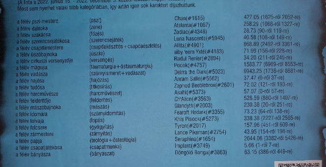 [11:52] játékvezető: valójában csak beírtuk annak, aki jelezte [11:51] játékvezető: rossz szóhanálat volt, hogy "javítottuk" [11:41] Danair: nem, nem jelentek meg [10:41] Miko: javitottak, megjelentek a jutalmak [10:20] Pjtor: itt a bizonyitek ra, hogy rossz a szamlaszamod [09:59] Danair: Jaja nincsenek befizetési jutalmak [08:24] Neal: Grat a helyezetteknek! [13:51] Chan: Alaria: grat! :) [11:36] Gwill: valami fura random probléma lehet, mert több embernek sem jelentek meg az ikonok [11:33] cobal: A problémám a kis ikonok hiánya. [10:51] Titusz mester: Azokat szet lehet osztani. Ld . Karakterek mellett a kis ikonok [09:35] cobal: Sziasztok! Befizetési jutalmak késve érkeznek? Csak zsetonokat kaptam. [04:37] Alaria: Minden idok legsikeresebb olimpiam lett! :) [23:05] cabal: Köszönjük a szervezést és a levezetést a résztvevőknek! :) [20:52] Garaz: Kati,köszönjük a szervezést, megint jó volt a tali!